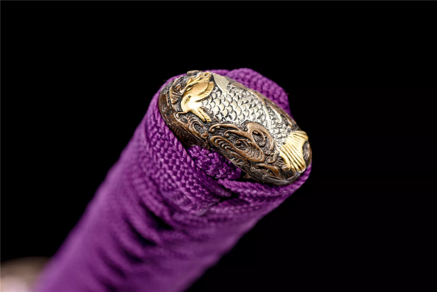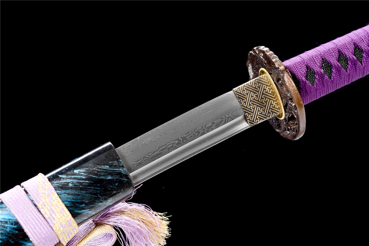 Entdecken Sie das Katana Yunmeng, ein mächtiges Samurai-Schwert, handgeschmiedet aus Damaszener Stahl, gefaltet und bei 90 Grad geschmiedet für hohe Geradheit und Härte, erreicht es 60 Grad. Dieses Schwert verfügt über eine scharfe Klinge und hohe Präzision, perfekt für Sammler und Liebhaber der Kampfkunst. Der Griff ist mit Perlmuttfischleder verziert und von Hand mit einer Schnur umwickelt, was einen komfortablen und sicheren Halt bietet.